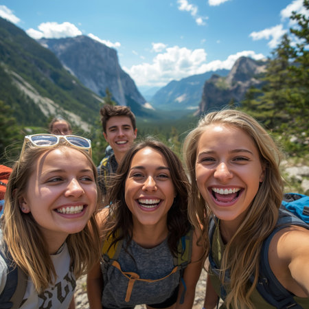 selfie of group of diverse young people friends hiking in the mountains close-up