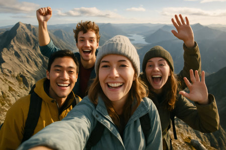 Four hikers with backpacks take a selfie while walking across the mountains. GENERATE AI
