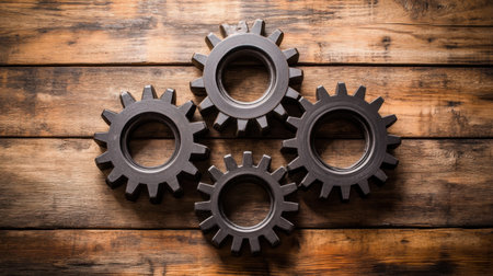 A close-up view of four metal gears arranged on a rustic wooden surface, symbolizing engineering, industry, and mechanical design concepts effectively.