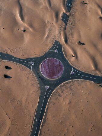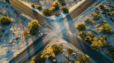 This aerial image showcases a striking intersection in a desert environment, featuring unique road patterns and natural elements. The interplay of shadows and light creates a captivating visual.