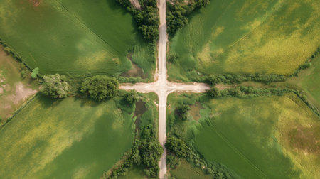 Intersection of dirt roads among green fields in rural landscape during daylight