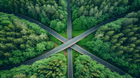 This aerial image captures a modern highway intersection surrounded by lush greenery, highlighting the contrast between urban infrastructure and natural landscapes.