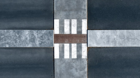 Minimalist top-down view of a crosswalk and asphalt textures, simple urban design and geometry concept