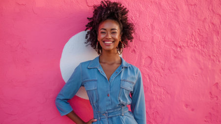 Contemporary Joy in Vibrant Pink: Woman in Denim Jumpsuit, Relaxed Confidence, Natural Black Curls, White Circular Shape Contrast, Bright Even Lighting