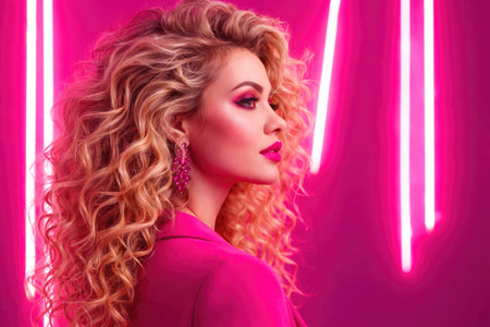 Stylish Fashion Portrait of Glamorous Woman in Pink Neon Light