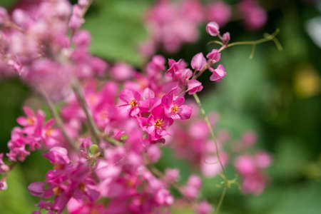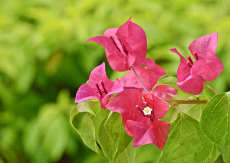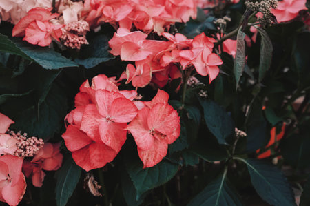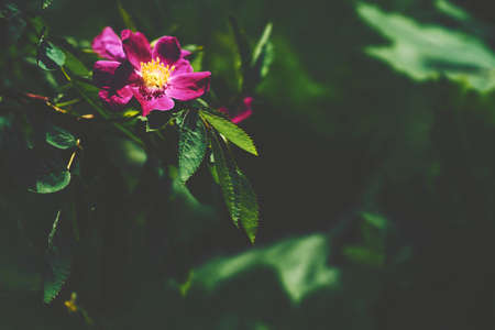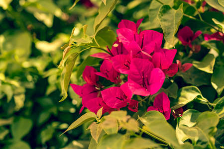 Bush group of small pink fuchsia flowers with green leaves, selective focus, shallow depth of field, toned with filters, copy space for text, green background
