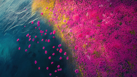 Experience the breathtaking beauty of a vibrant pink coral reef juxtaposed against turquoise water in this stunning aerial view. Perfect for marine life enthusiasts!