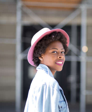 Portrait of young fashionable black woman walking on city street. Photographed in NYC in Sept 2016.