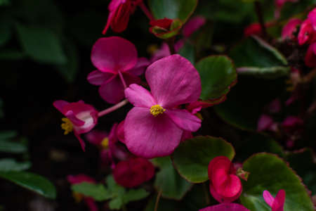 Beautiful small pink begonia flowers with yellow center and green leaves in a garden bed. Summer blooming