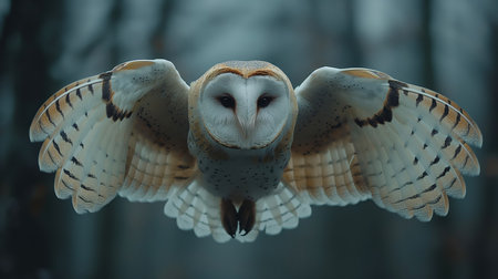 A magnificent owl soars silently through the dark night, its wings spread wide and feathers glistening softly. The ethereal atmosphere enhances its grace, capturing a moment of nature's haunting beauty in flight.