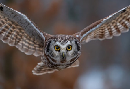 An owl is captured mid-flight with wings spread, revealing intricate feather patterns. The bird features large, focused eyes against a backdrop of blurred natural elements. This image showcases detailed textures and a neutral color palette suitable for editorial or commercial applications.
