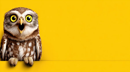 A curious owl with wide eyes and open beak peeks from behind a yellow plane. The bird features brown and white patterned feathers, set against a plain background. Its expression suggests surprise or excitement. The simple composition and vivid colors suggest use for various commercial and editorial applications.