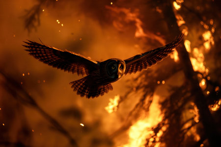 An owl glides silently through the trees at dusk, showcasing its striking feathers