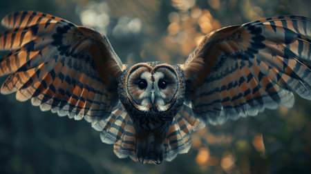 An exceptional photograph capturing a majestic owl gracefully flying under soft lights in a tranquil forest setting, symbolizing freedom and beauty.