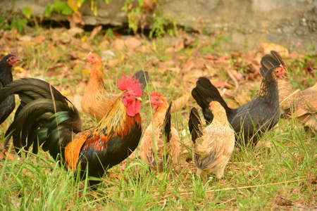 The scene in the morning, Group of family hens and rooster searching for food on the grass field.
