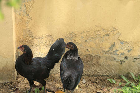 black feathered hen is growing and tricky on the ground- red crested grass indicates its age against - yellow concrete wall background.