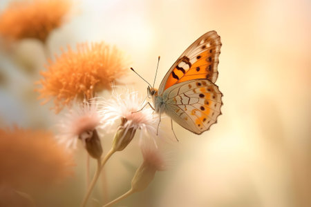 Generative AI : Spring background with light transparent flowers dandelion and flitting orange butterfly in pastel light tones macro with soft focus Delicate airy elegant artistic