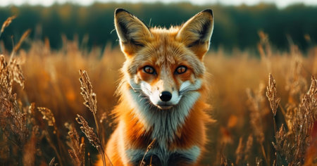 a red fox stands in a field, bathed in golden light. the realistic depiction of light enhances the close-up view of the fox. the fur is a beautiful blend of light red and violet, while the background features light white and amber tones. this captivating image on furaffinity tells a narrative-driven visual story. ai generated