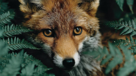 A red fox stares intently at the camera, its amber eyes gleaming in the low light of the forest