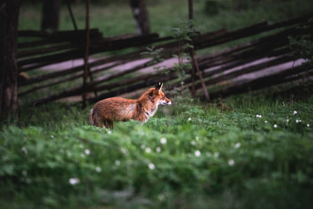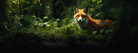Red fox emerging from a dark forest background, creating a captivating banner with ample copy space