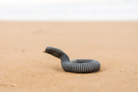 A discarded, flexible plastic conduit or corrugated pipe resembling a snake lies on a sandy beach, highlighting plastic pollution and human impact on coastal and marine environments