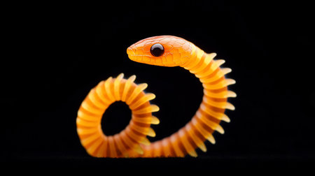 A segmented, orange snake is coiled, with a smooth head and black eyes, against a dark background.