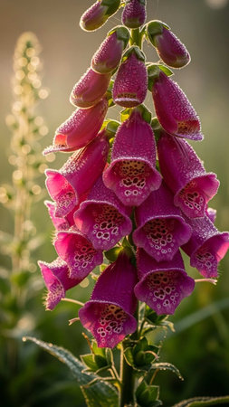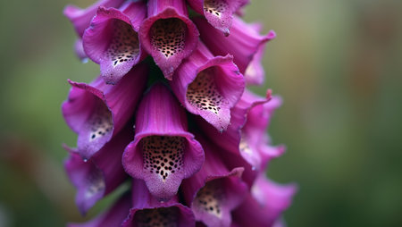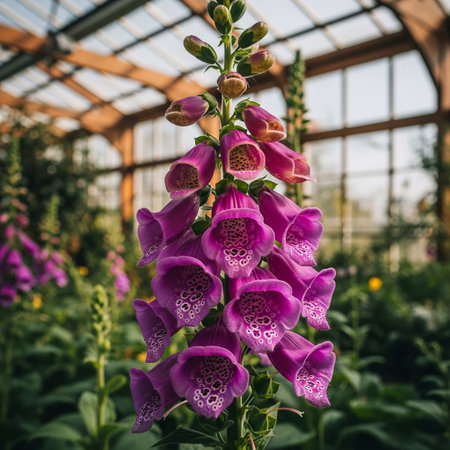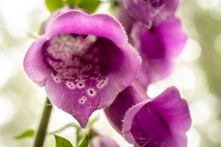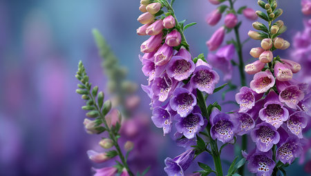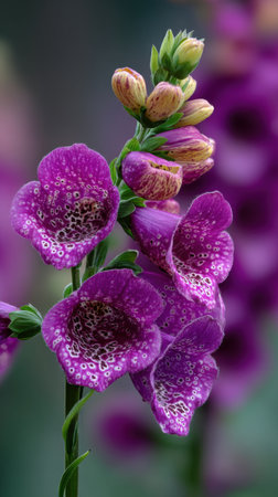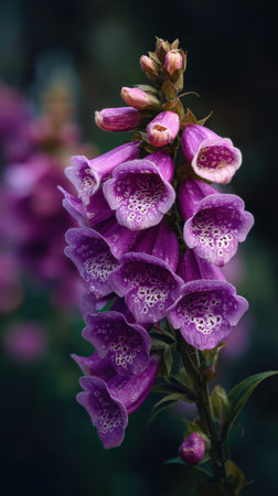 A close-up captures foxglove flowers in various stages of bloom, showcasing vibrant purple hues. The image highlights delicate petal textures and intricate patterns. Soft lighting and a blurred background create a sense of depth, suggesting an outdoor environment. Suitable for editorial and commercial use.