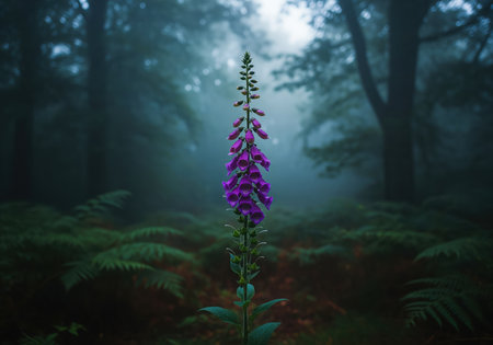 Towering purple foxglove flower stalk standing prominently in a dense, dark, and misty forest environment, surrounded by ferns and deep shadows.