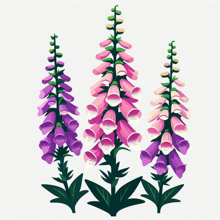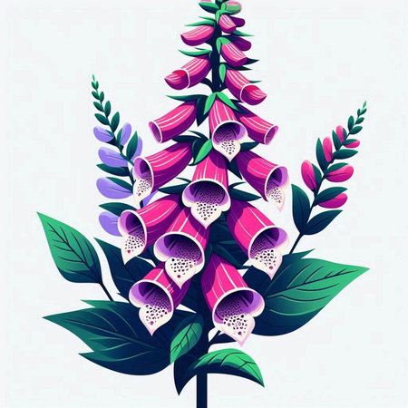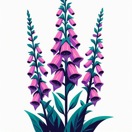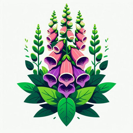 Illustration of foxglove flowers with green leaves on white background