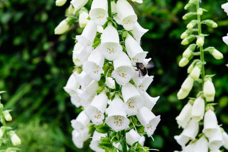 Close up of white flowers of Digitalis plant, commonly known as foxgloves, in full bloom and green grass in a sunny spring garden, beautiful outdoor floral background photographed with soft focus