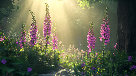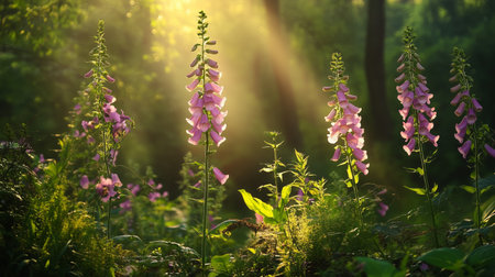 Captures a tranquil forest scene with foxglove flowers bathed in sunlight. The lush greenery and detailed flora enhance the beauty of the sunlit environment.