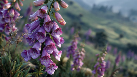 A cluster of purple foxglove flowers is prominently displayed, showcasing their bell-shaped blossoms. The image reveals detailed textures and a subtle gradient of colors. The background features a green hillside, suggesting a natural outdoor environment. Suitable for editorial and commercial projects.