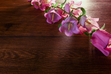 Bouquet of pink bellflower isoltwd on a wooden background with copy space.