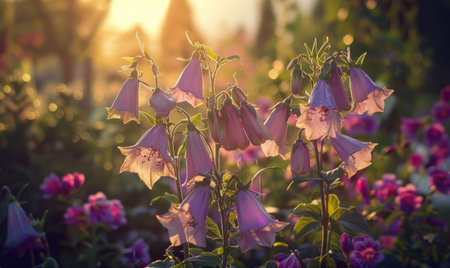 The image captures a cluster of foxglove flowers in full bloom. The flowers exhibit a gradient of purple hues, with delicate patterns. The composition is set against a soft, unfocused background and illuminated by natural light. This photograph is appropriate for various commercial applications, including decorative and illustrative purposes.