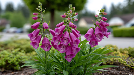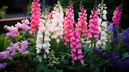 Beautiful pink foxglove blossoms growing outdoors in a lush green garden