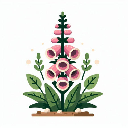 Vector illustration of pink foxglove with green leaves isolated on white background.