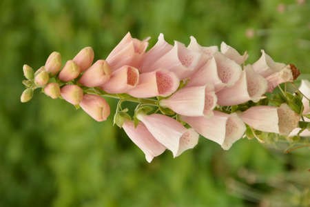 Closeup of a pink apricot color Foxglove Digitalis flower stalk. Selective focus with extreme shallow depth of field.