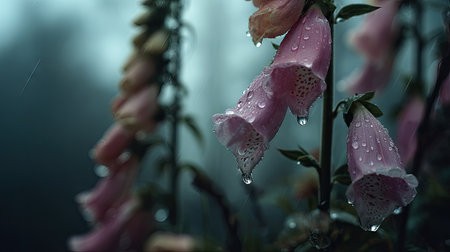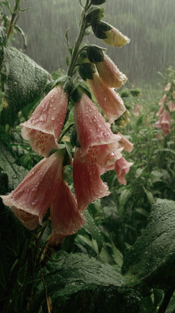 Foxglove in a storm, heavy rain pouring down, strong winds twisting their leaves, natural.