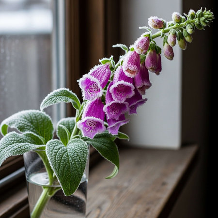 Foxglove, Digitalis purpurea, in a glass vase on the windowsill