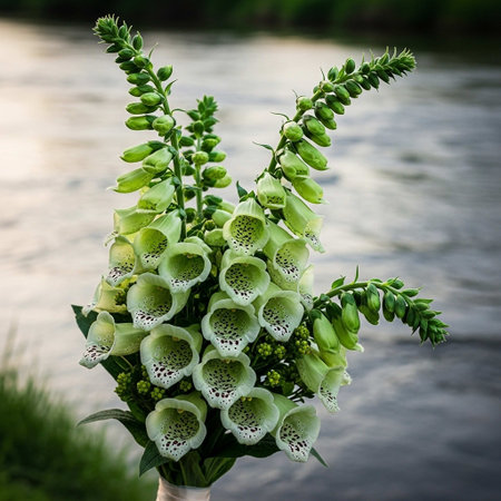 Bouquet of green foxglove flowers on a background of water