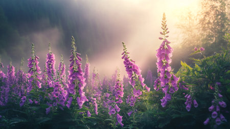 Delicate pink foxgloves blooming in a sunlit forest during early morning hours