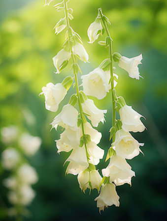 A detailed close-up captures the striking elegance of a white foxglove flower stalk, its blooms rising gracefully against a blurred, bokeh-filled natural garden setting.
