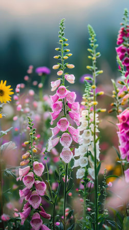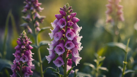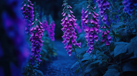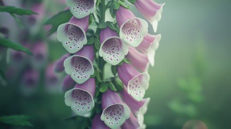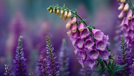 This image showcases a close-up view of foxglove flowers, showcasing a range of purple hues. The composition highlights the intricate patterns on the petals and the lush green foliage. Soft lighting and a blurred background create a dreamy atmosphere, suitable for various editorial and commercial applications.