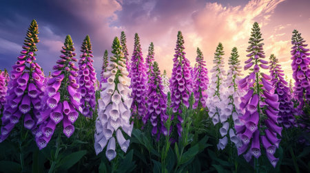 A stunning scene showcasing a vibrant field of foxglove flowers in shades of purple and white set against a dramatic sunset sky, creating a serene atmosphere.