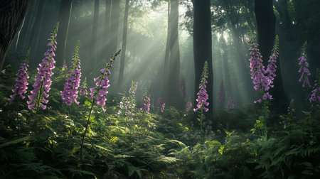 Sunlight filters through trees illuminating blooming foxgloves in a serene forest setting during early morning hours