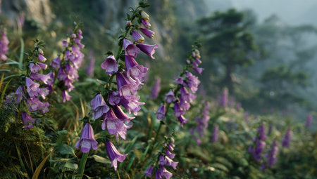 The image features close-up of blooming purple foxglove flowers set against a backdrop of a blurred green landscape. The shot employs shallow depth of field, with soft focus on the flowers, creating a delicate, dreamy effect. This image could be useful for projects related to nature, gardening, or environmental themes. It's suitable for various commercial or editorial applications.