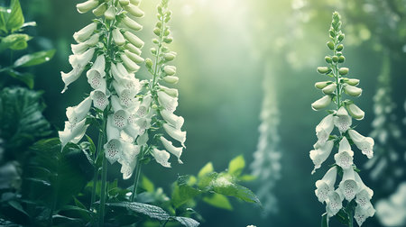 Captivating image features detailed foxglove flowers displaying pure white blossoms and uniquely spotted throats, flourishing within a vibrant, lush garden backdrop.