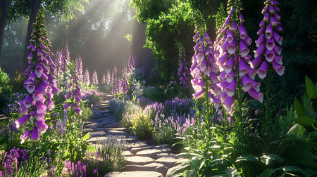 A tranquil garden scene featuring a stone path lined with vibrant purple foxgloves. Sunlight filters through the trees, illuminating the flowers and creating a magical atmosphere.