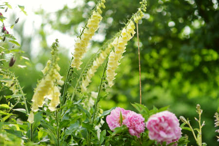 Beautiful yellow foxglove flowers blossoming in the garden on sunny summer day. Digitalis purpurea blooming on a flower bed.