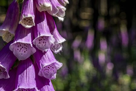 This image showcases a collection of foxglove flowers, with their distinctive bell-shaped blooms. The flowers display a spectrum of purple hues, with a soft-focus background of green foliage. The natural lighting and composition are suitable for various commercial projects and editorial use, providing a serene and natural aesthetic.